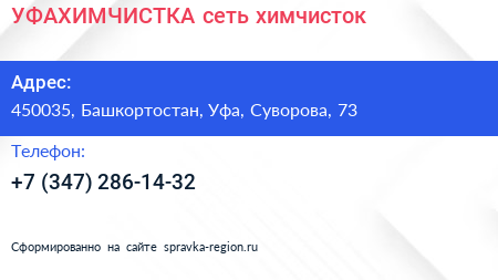 УФАХИМЧИСТКА, сеть химчисток по адресу 450035, Башкортостан, Уфа, Суворова, 73 в дальнейшем Организация, размещена в следующих категориях: