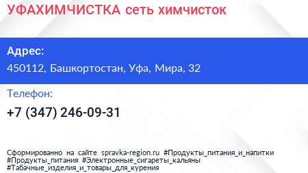 УФАХИМЧИСТКА, сеть химчисток по адресу 450112, Башкортостан, Уфа, Мира, 32 в дальнейшем Организация, размещена в следующих категориях: