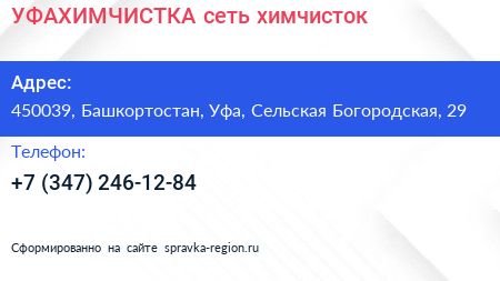УФАХИМЧИСТКА, сеть химчисток по адресу 450039, Башкортостан, Уфа, Сельская Богородская, 29 в дальнейшем Организация, размещена в следующих категориях: