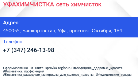 УФАХИМЧИСТКА, сеть химчисток по адресу 450055, Башкортостан, Уфа, проспект Октября, 164 в дальнейшем Организация, размещена в следующих категориях: