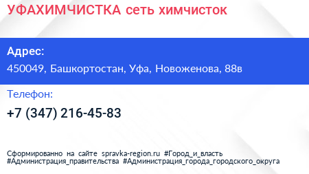 УФАХИМЧИСТКА, сеть химчисток по адресу 450049, Башкортостан, Уфа, Новоженова, 88в в дальнейшем Организация, размещена в следующих категориях: