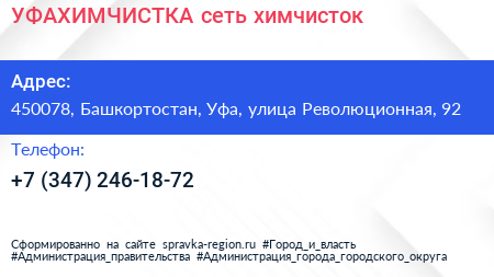 УФАХИМЧИСТКА, сеть химчисток по адресу 450078, Башкортостан, Уфа, улица Революционная, 92 в дальнейшем Организация, размещена в следующих категориях:
