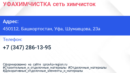 УФАХИМЧИСТКА, сеть химчисток по адресу 450112, Башкортостан, Уфа, Шумавцова, 23а в дальнейшем Организация, размещена в следующих категориях: