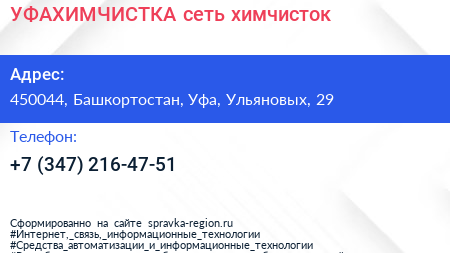УФАХИМЧИСТКА, сеть химчисток по адресу 450044, Башкортостан, Уфа, Ульяновых, 29 в дальнейшем Организация, размещена в следующих категориях: