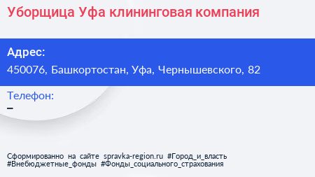 Уборщица Уфа, клининговая компания по адресу 450076, Башкортостан, Уфа, Чернышевского, 82 в дальнейшем Организация, размещена в следующих категориях: