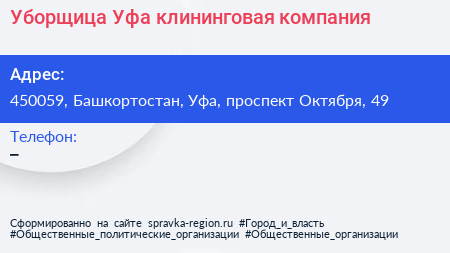 Уборщица Уфа, клининговая компания по адресу 450059, Башкортостан, Уфа, проспект Октября, 49 в дальнейшем Организация, размещена в следующих категориях: