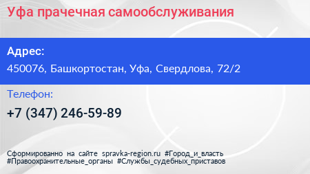 Уфа, прачечная самообслуживания по адресу 450076, Башкортостан, Уфа, Свердлова, 72/2 в дальнейшем Организация, размещена в следующих категориях:
