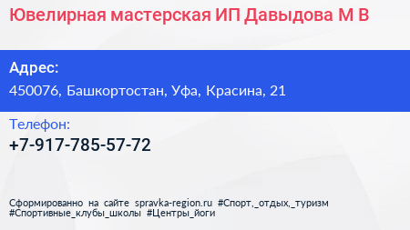 Ювелирная мастерская, ИП Давыдова М.В. по адресу 450076, Башкортостан, Уфа, Красина, 21 в дальнейшем Организация, размещена в следующих категориях: