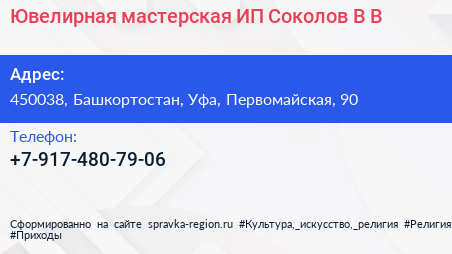 Ювелирная мастерская, ИП Соколов В.В. по адресу 450038, Башкортостан, Уфа, Первомайская, 90 в дальнейшем Организация, размещена в следующих категориях: