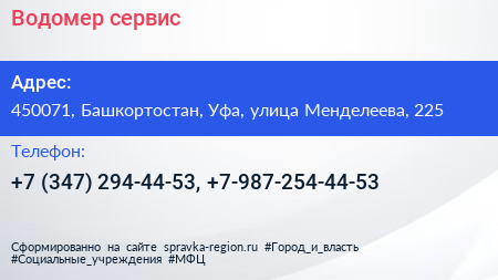 Водомер-сервис по адресу 450071, Башкортостан, Уфа, улица Менделеева, 225 в дальнейшем Организация, размещена в следующих категориях: