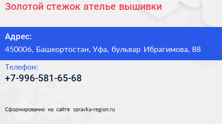 Золотой стежок, ателье вышивки по адресу 450006, Башкортостан, Уфа, бульвар Ибрагимова, 88 в дальнейшем Организация, размещена в следующих категориях: