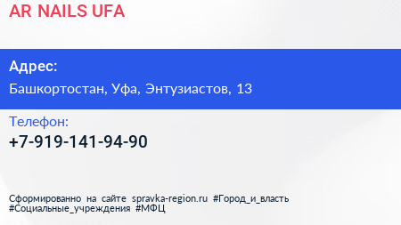 AR.NAILS.UFA по адресу Башкортостан, Уфа, Энтузиастов, 13 в дальнейшем Организация, размещена в следующих категориях: