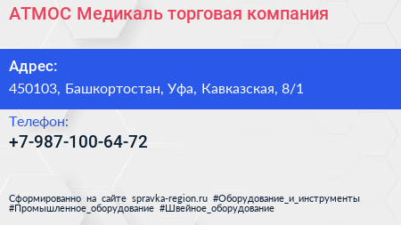 АТМОС Медикаль, торговая компания по адресу 450103, Башкортостан, Уфа, Кавказская, 8/1 в дальнейшем Организация, размещена в следующих категориях: