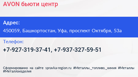 AVON, бьюти-центр по адресу 450059, Башкортостан, Уфа, проспект Октября, 53а в дальнейшем Организация, размещена в следующих категориях: