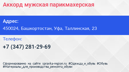 Аккорд, мужская парикмахерская по адресу 450024, Башкортостан, Уфа, Таллинская, 23 в дальнейшем Организация, размещена в следующих категориях: