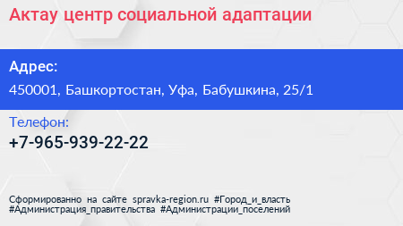Актау, центр социальной адаптации по адресу 450001, Башкортостан, Уфа, Бабушкина, 25/1 в дальнейшем Организация, размещена в следующих категориях: