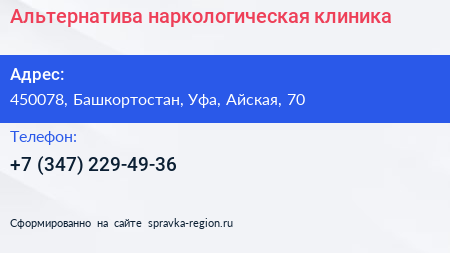 Альтернатива, наркологическая клиника по адресу 450078, Башкортостан, Уфа, Айская, 70 в дальнейшем Организация, размещена в следующих категориях: