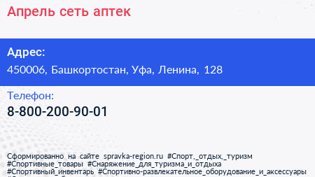 Апрель, сеть аптек по адресу 450006, Башкортостан, Уфа, Ленина, 128 в дальнейшем Организация, размещена в следующих категориях: