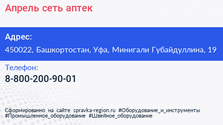Апрель, сеть аптек по адресу 450022, Башкортостан, Уфа, Минигали Губайдуллина, 19 в дальнейшем Организация, размещена в следующих категориях: