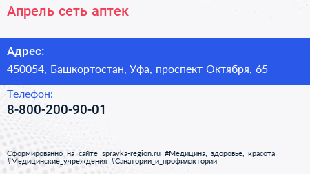 Апрель, сеть аптек по адресу 450054, Башкортостан, Уфа, проспект Октября, 65 в дальнейшем Организация, размещена в следующих категориях: