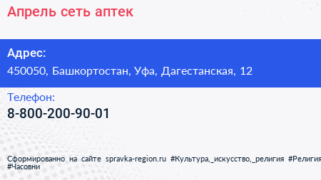 Апрель, сеть аптек по адресу 450050, Башкортостан, Уфа, Дагестанская, 12 в дальнейшем Организация, размещена в следующих категориях:
