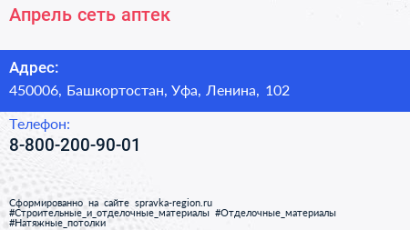 Апрель, сеть аптек по адресу 450006, Башкортостан, Уфа, Ленина, 102 в дальнейшем Организация, размещена в следующих категориях: