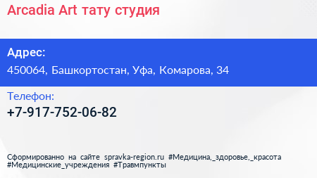 Arcadia Art, тату-студия по адресу 450064, Башкортостан, Уфа, Комарова, 34 в дальнейшем Организация, размещена в следующих категориях: