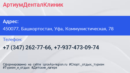 АртиумДенталКлиник по адресу 450077, Башкортостан, Уфа, Коммунистическая, 78 в дальнейшем Организация, размещена в следующих категориях: