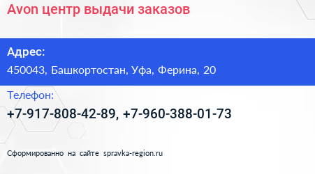 Avon, центр выдачи заказов по адресу 450043, Башкортостан, Уфа, Ферина, 20 в дальнейшем Организация, размещена в следующих категориях: