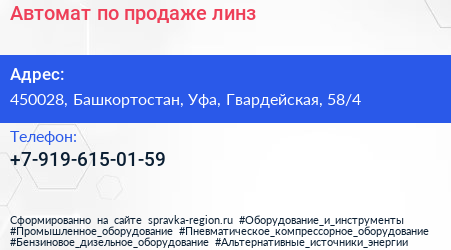 Автомат по продаже линз по адресу 450028, Башкортостан, Уфа, Гвардейская, 58/4 в дальнейшем Организация, размещена в следующих категориях: