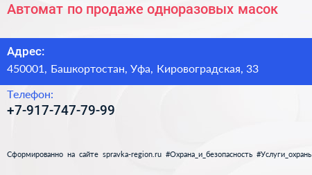 Автомат по продаже одноразовых масок по адресу 450001, Башкортостан, Уфа, Кировоградская, 33 в дальнейшем Организация, размещена в следующих категориях: