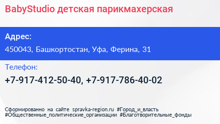 BabyStudio, детская парикмахерская по адресу 450043, Башкортостан, Уфа, Ферина, 31 в дальнейшем Организация, размещена в следующих категориях: