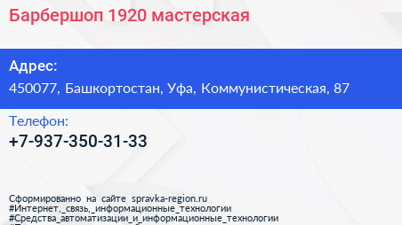 Барбершоп 1920, мастерская по адресу 450077, Башкортостан, Уфа, Коммунистическая, 87 в дальнейшем Организация, размещена в следующих категориях:
