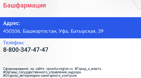 Башфармация по адресу 450106, Башкортостан, Уфа, Батырская, 39 в дальнейшем Организация, размещена в следующих категориях: