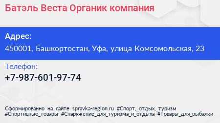 Батэль Веста Органик, компания по адресу 450001, Башкортостан, Уфа, улица Комсомольская, 23 в дальнейшем Организация, размещена в следующих категориях: