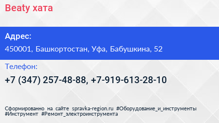 Beaty хата по адресу 450001, Башкортостан, Уфа, Бабушкина, 52 в дальнейшем Организация, размещена в следующих категориях: