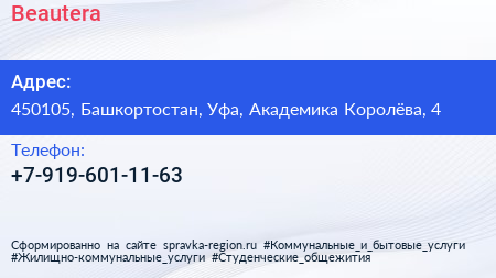 Beautera по адресу 450105, Башкортостан, Уфа, Академика Королёва, 4 в дальнейшем Организация, размещена в следующих категориях: