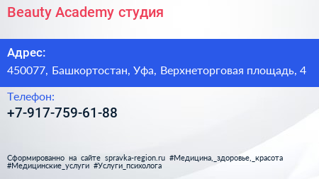 Beauty Academy, студия по адресу 450077, Башкортостан, Уфа, Верхнеторговая площадь, 4 в дальнейшем Организация, размещена в следующих категориях: