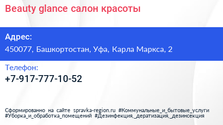 Beauty glance, салон красоты по адресу 450077, Башкортостан, Уфа, Карла Маркса, 2 в дальнейшем Организация, размещена в следующих категориях: