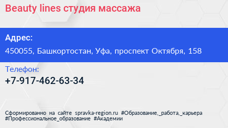 Beauty lines, студия массажа по адресу 450055, Башкортостан, Уфа, проспект Октября, 158 в дальнейшем Организация, размещена в следующих категориях: