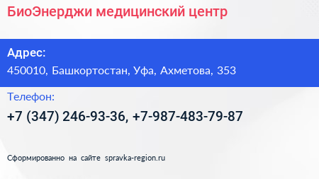 БиоЭнерджи, медицинский центр по адресу 450010, Башкортостан, Уфа, Ахметова, 353 в дальнейшем Организация, размещена в следующих категориях: