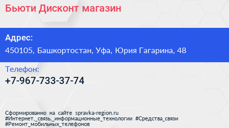 Бьюти Дисконт, магазин по адресу 450105, Башкортостан, Уфа, Юрия Гагарина, 48 в дальнейшем Организация, размещена в следующих категориях: