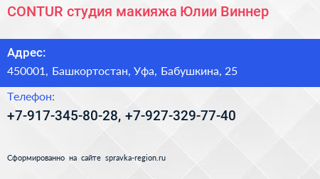CONTUR, студия макияжа Юлии Виннер по адресу 450001, Башкортостан, Уфа, Бабушкина, 25 в дальнейшем Организация, размещена в следующих категориях: