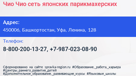 Чио Чио, сеть японских парикмахерских по адресу 450006, Башкортостан, Уфа, Ленина, 128 в дальнейшем Организация, размещена в следующих категориях: