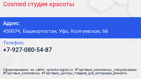 Cosmed, студия красоты по адресу 450074, Башкортостан, Уфа, Колгуевская, 68 в дальнейшем Организация, размещена в следующих категориях: