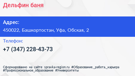 Дельфин, баня по адресу 450022, Башкортостан, Уфа, Обская, 2 в дальнейшем Организация, размещена в следующих категориях:
