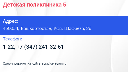 Детская поликлиника №5 по адресу 450054, Башкортостан, Уфа, Шафиева, 26 в дальнейшем Организация, размещена в следующих категориях: