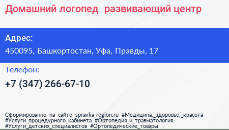 Домашний логопед+, развивающий центр по адресу 450095, Башкортостан, Уфа, Правды, 17 в дальнейшем Организация, размещена в следующих категориях: