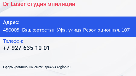 Dr.Laser, студия эпиляции по адресу 450005, Башкортостан, Уфа, улица Революционная, 107 в дальнейшем Организация, размещена в следующих категориях: