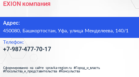 EXION, компания по адресу 450080, Башкортостан, Уфа, улица Менделеева, 140/1 в дальнейшем Организация, размещена в следующих категориях: